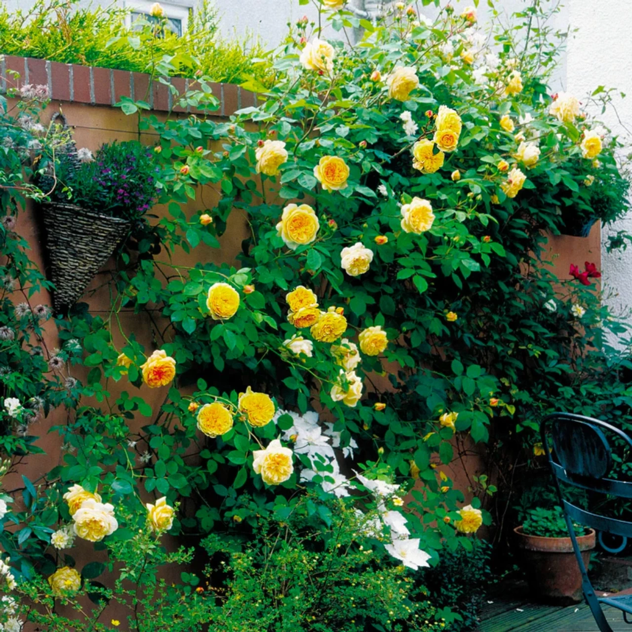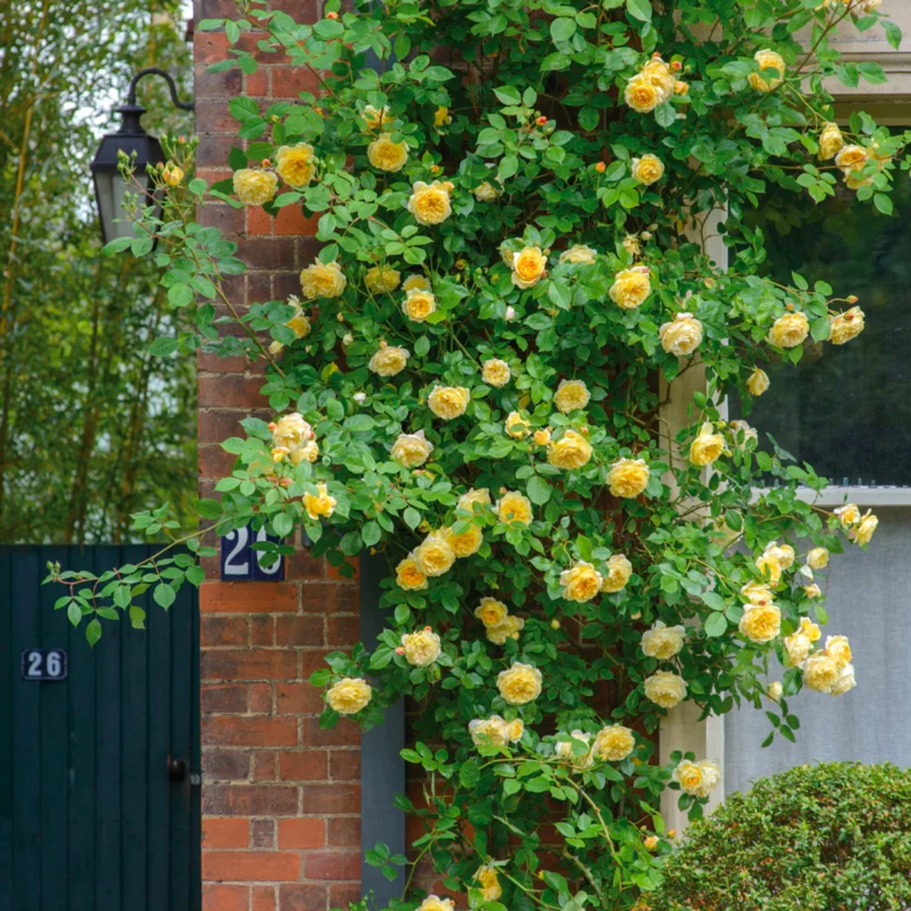 A typical David Austin showstopper, Teasing Georgia Rose is an English climbing rose consisting of 5-inch, double flowers with ultra-soft petals, fading from honey yellow to buttermilk from the center outwards. The blooms are supported by attractive imperial-green foliage that is vigorous and disease resistant. The cut flower-quality blooms appear from spring through autumn, this ornamental’s allure can be seen inside the home as well as outside in the yard. Its traditional tea perfume captivates pollinators such as bees and butterflies. This perennial, also known as Rosa Teasing Georgiaâ„¢, ‘P/27/88’, ‘AUSbaker’, and ‘TG2476’, reaches a maximum height of 4 to 8 feet and spread of 3 to 4 feet and is cold hardy in zones 5 – 8.