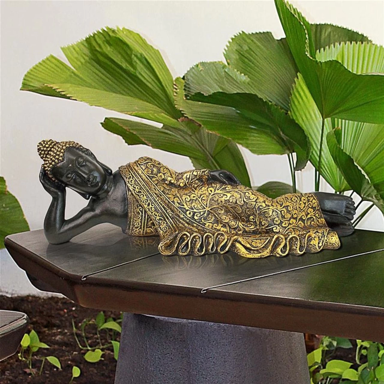 About to enter the parinirvana of the afterlife, the peacefully reclining Buddha is a historic pose dating to the second century. Sculpted with the serenity of the ancient monasteries, this dimensional work of decorative Asian art is cast in quality designer resin, hand painted in an ebony hue and “kissed” with the golden glow of a life well lived. The peaceful Asian nature of this Basil Street Gallery exclusive sculpture allows it to set the perfect tone in a quiet spot for meditation in your home.