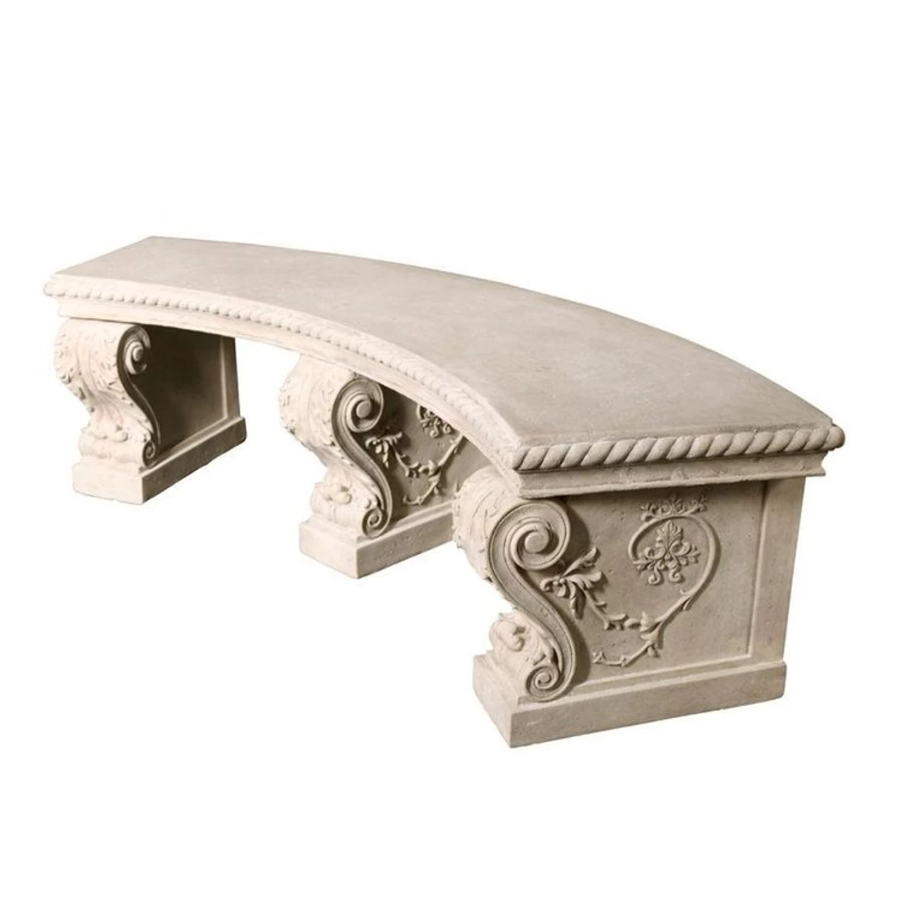 Over six feet long from end to end, this timelessly beautiful architectural bench is a classic that curves to help conversation flow in Dowager-worthy status! Embellished with a subtle acanthus leaf design that instantly elevates the quality of your outdoor space, our DT-exclusive substantial bench is crafted of reinforced fiberglass resin with a faux French limestone finish to give this accent piece the look of a stylish, European garden antique. Simple assembly required.