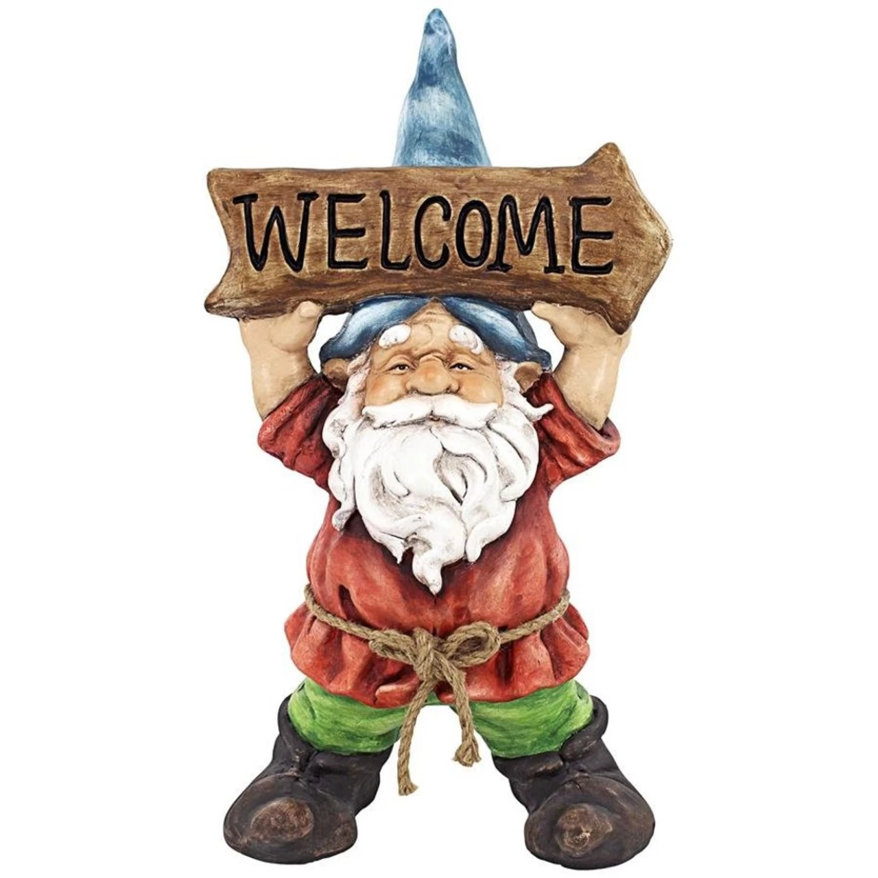 We love a gnome with a BIG sense of direction! As an almost two-foot tall statement piece, Willie directs to your entryway, vegetable plot or garden flowerbed with a generous gnome welcome sign and a winsomely wide smile. Sporting a pointy red elf hat, a wizened gnome beard and a real rope belt, this DT-exclusive garden elf invites guests to your happy home. Imaginatively sculpted, our quality designer resin garden gnome statue is hand painted one-piece-at-a-time in woodland hues as a gift to yourself or another gnome lover. 12″Wx8″Dx22″H. 9 lbs.